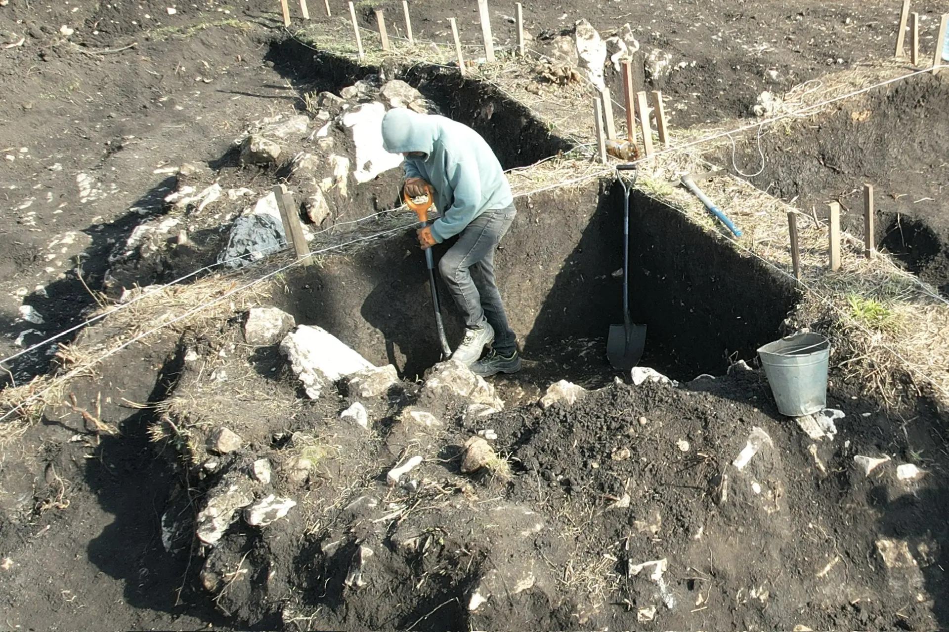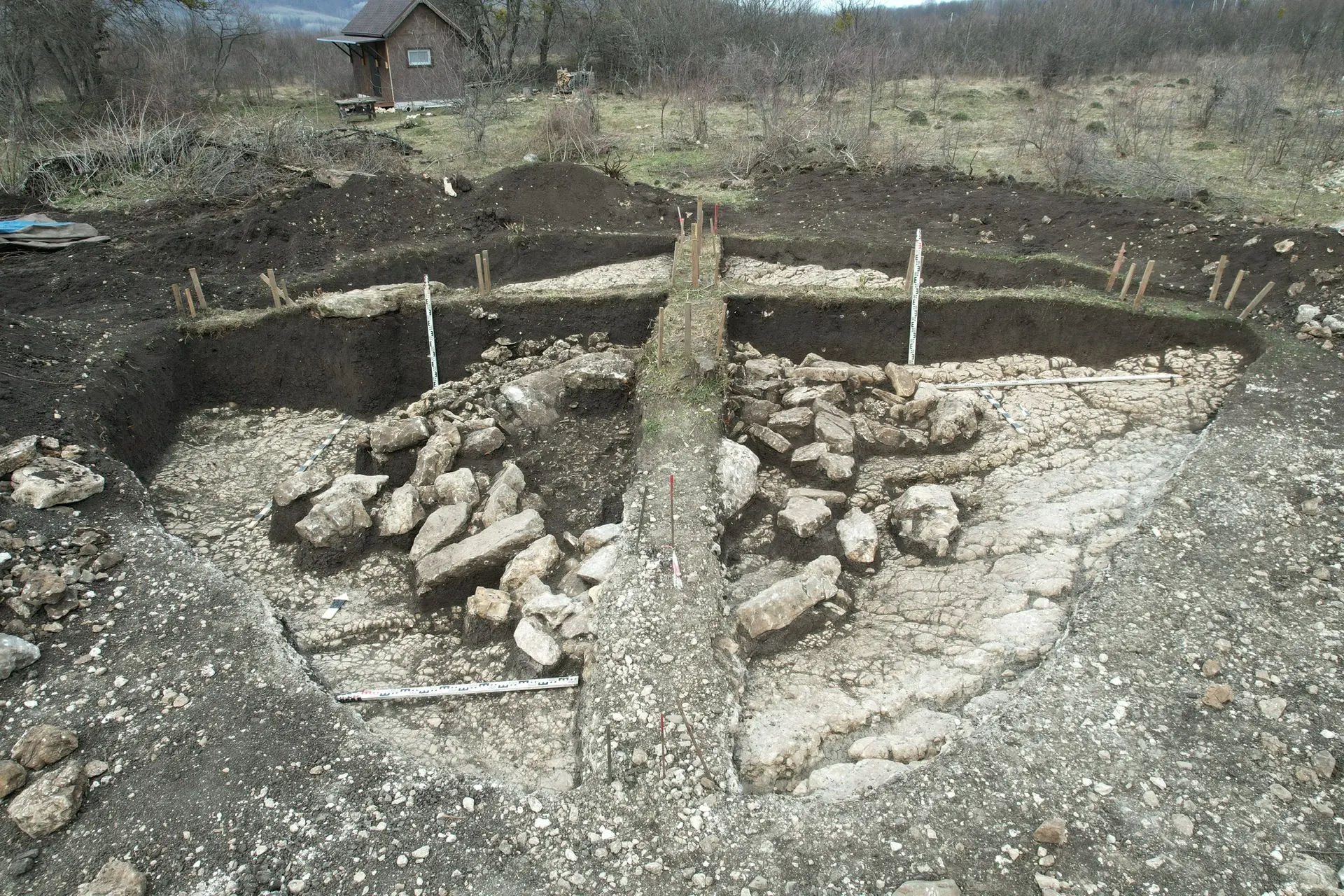 При этом наибольший интерес вызвал курган «Руфабзо-40». Под его насыпью археологи выявили коллективное погребение, включающее останки не менее пяти человек. По предварительным данным, объект относится к XVII–XVI векам до нашей эры и связан с постдольменной культурной традицией. Конструкция включала массивную каменную плиту-перекрытие и боковые стенки, что визуально сближает ее с дольменами, однако полноценным дольменом сооружение не является. Погребение было дополнительно укреплено крупными камнями, удерживавшими конструкцию от разрушения.